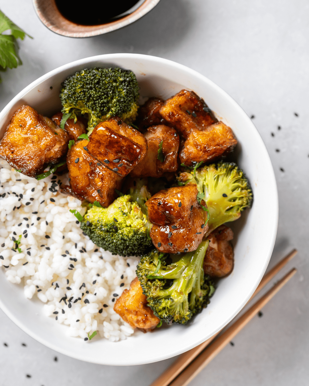 - Assemble bowls: rice on bottom, tofu, and veggies on top.